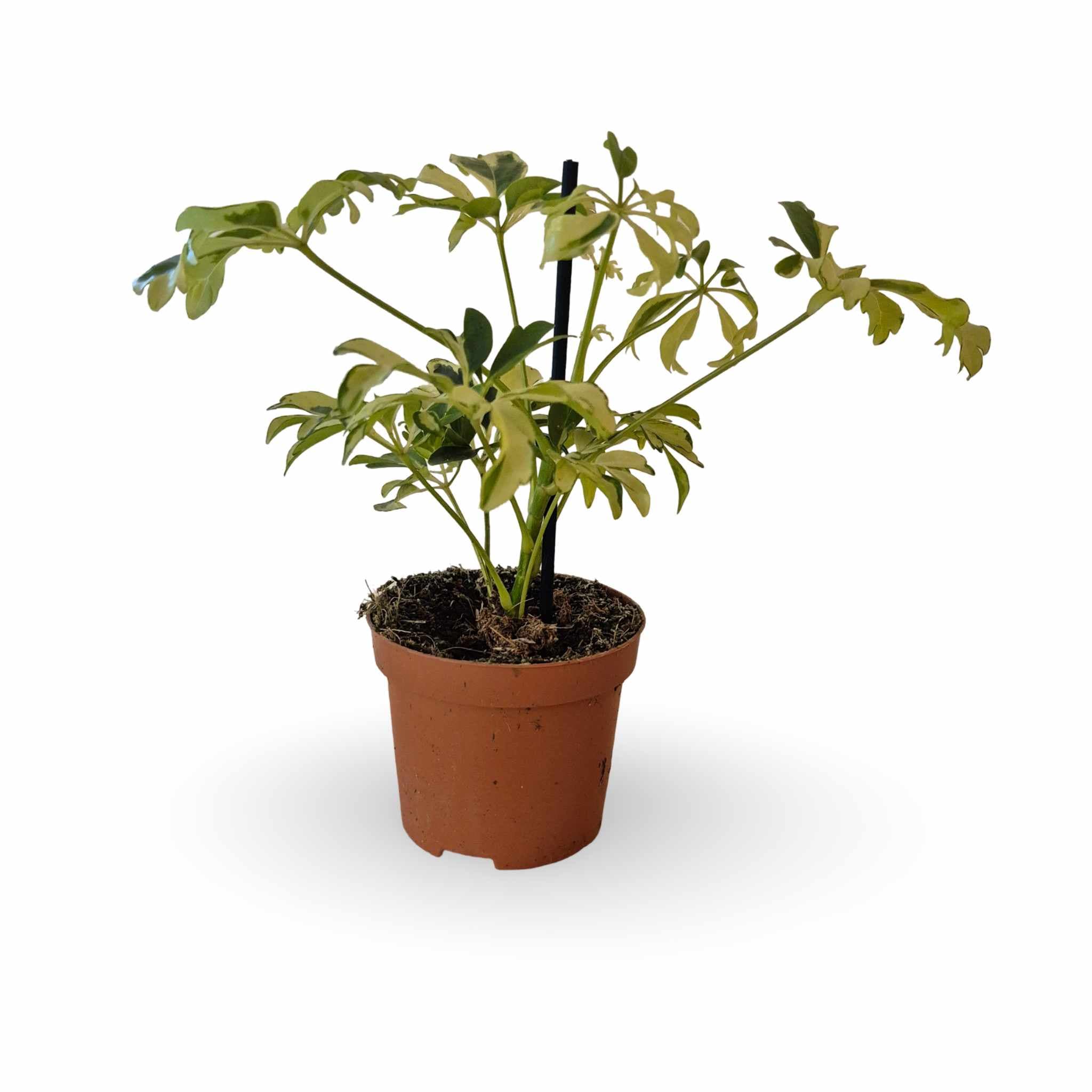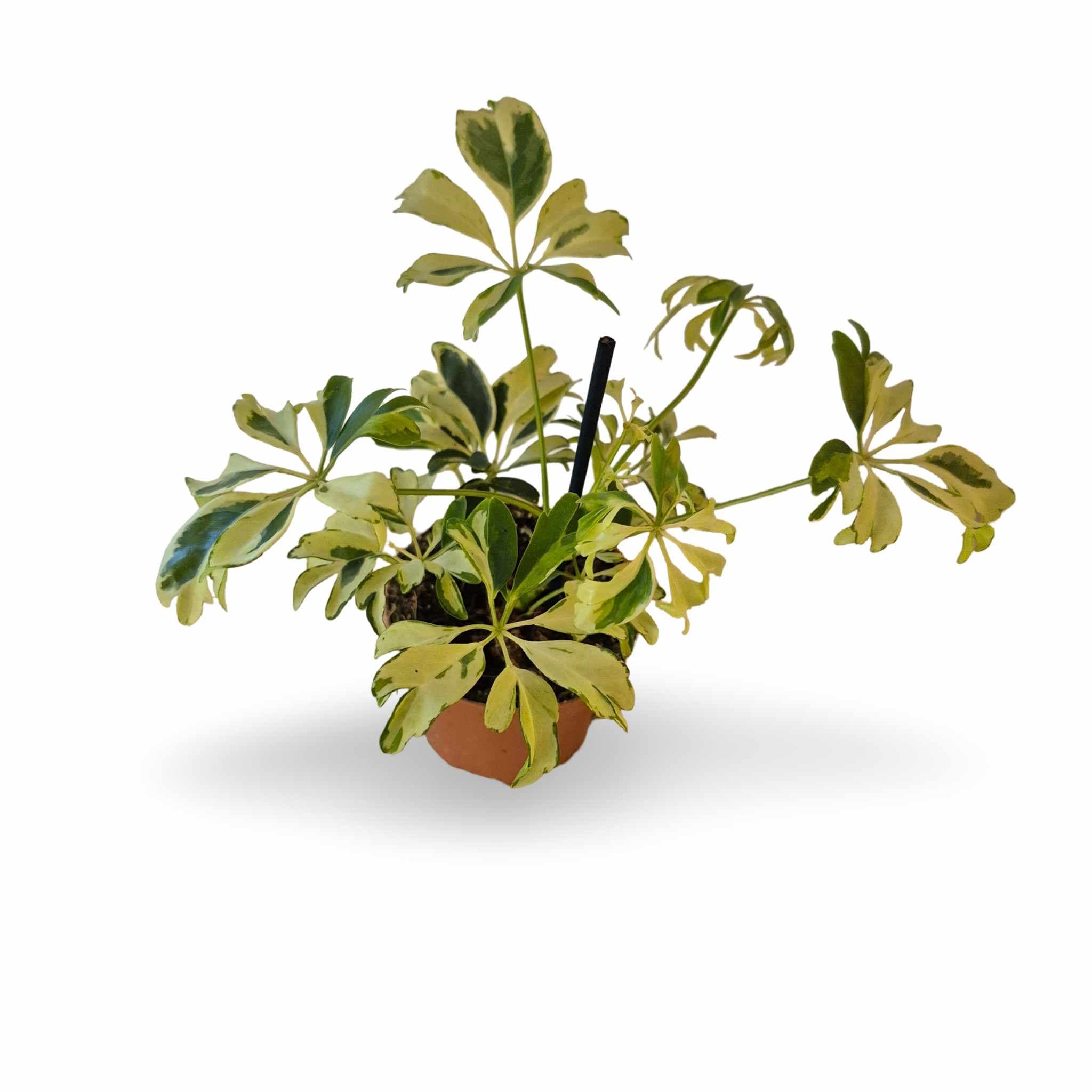 Schefflera Janine’ er en elegant plante med brogede blade, der tilfører et strejf af raffinement til ethvert rum. Planten har en kompakt vækstform og kan nå en højde på op til 120 cm og en bredde på omkring 90 cm. Dens blanke, grønne blade med cremede gule kanter danner et karakteristisk paraplylignende mønster, hvor hver plante har sin egen unikke variation.